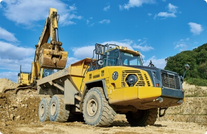 砕石事業では、火薬や電気による発破を行って岩石を砕きます。パワーショベルで原石を積み込み、ダンプカーで運搬し原石を製品ごとに破砕選別し、
