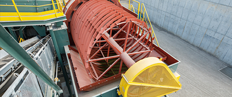 ドラムウォッシャーは30t/hの洗浄処理が可能で、強力な撹拌機と抜群の洗浄効果を誇ります。