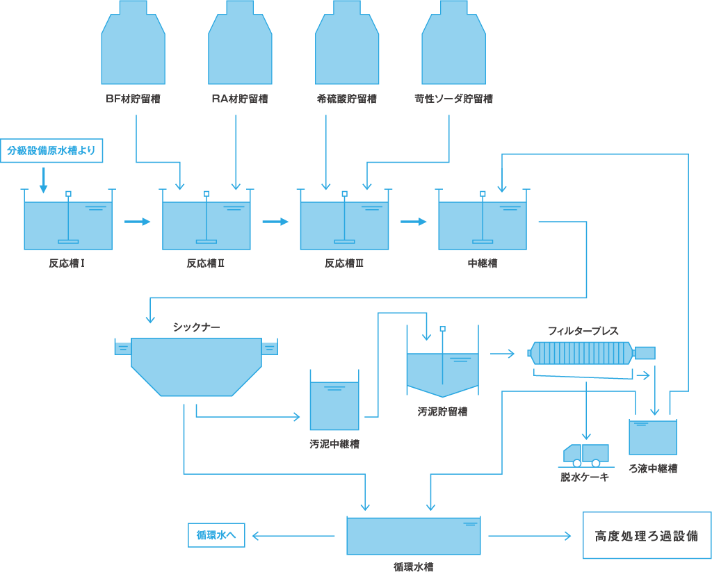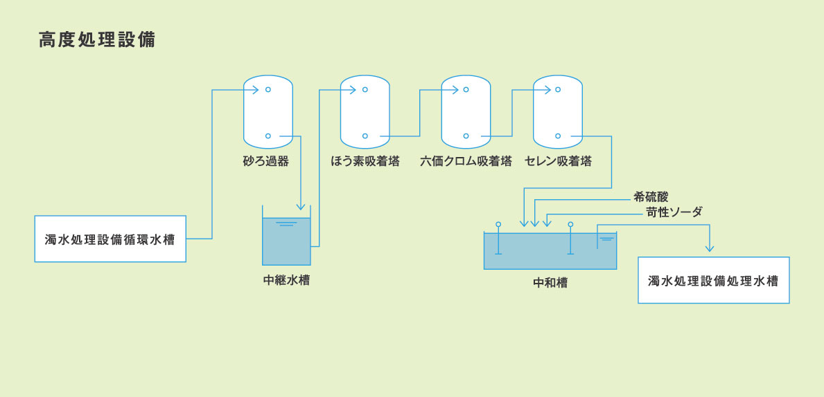 処理に利⽤した⽔は、⽔処理フローを経て循環⽔として利⽤されます。排⽔リサイクルシステムを構築し、徹底した⽔質管理を⾏っております。